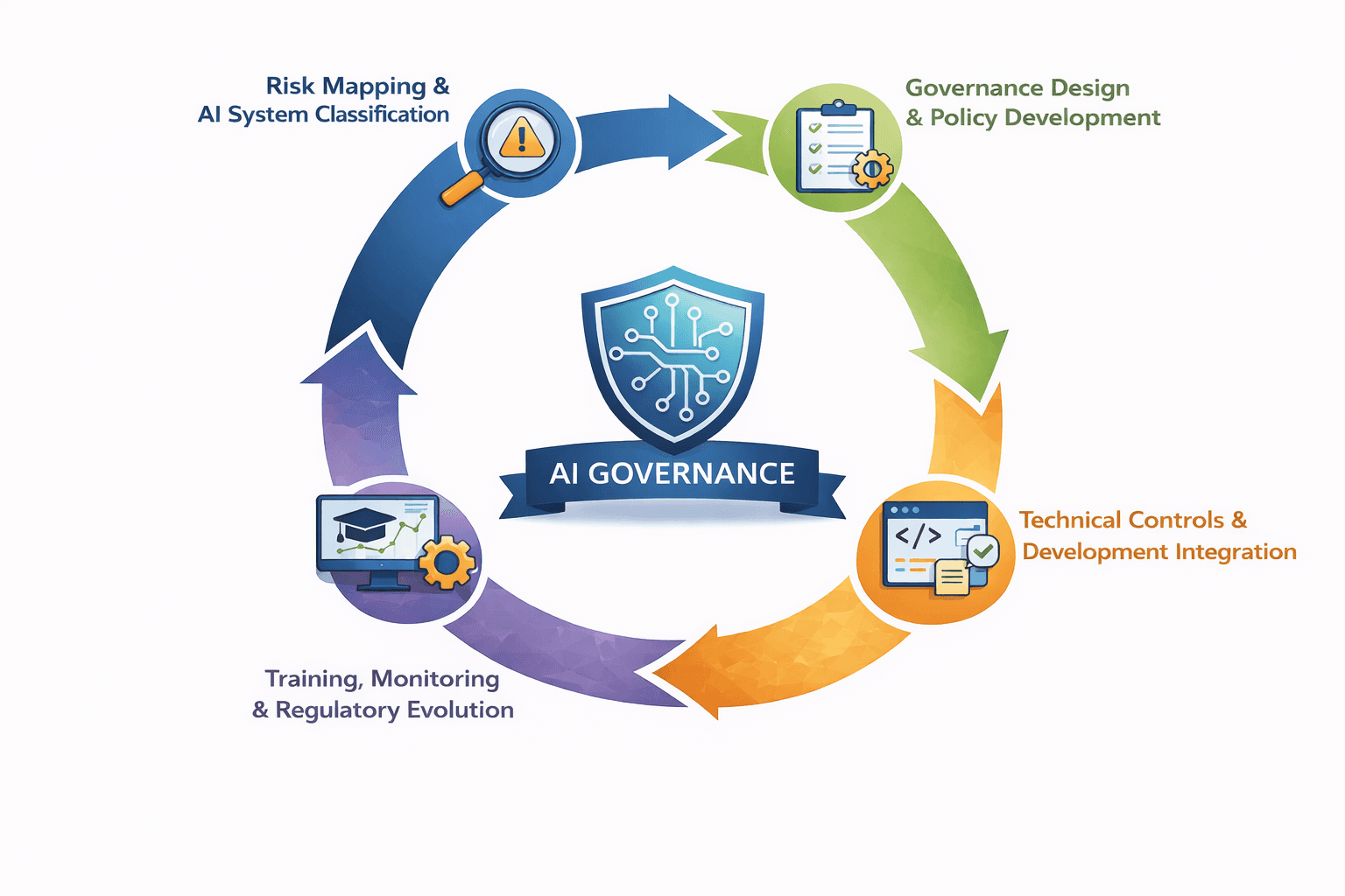 Effective AI governance requires both strategic design and technical implementation. Our process moves from risk mapping and principles design through to embedded controls, team training, and ongoing regulatory monitoring; ensuring governance keeps pace with your AI programme.